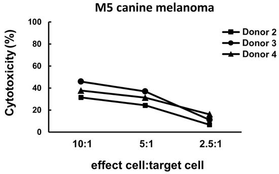 Representative cytotoxicity results of the infusion cell samples obtained from three healthy dog donors. The cytotoxicity was around 30% to nearly 50% when the E/T ratio was 10:1, was mildly decreased when the E/T ratio was 5:1, and dropped to less than 20% when the E/T ratio decreased to 2.5:1.