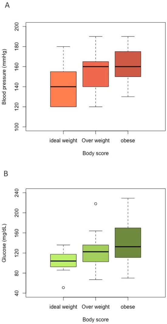 Regarding systolic blood pressure, the statistical differences between the ideal-weight and overweight groups and the obese group indicate that excess weight predisposes to increased systolic blood pressure. The mechanism possibly involves hemodynamic changes caused by obesity, which involve humoral, hormonal, and inflammatory substances produced by adipose tissue [28,29]. It is worth mentioning that blood pressure values in cats should be interpreted with caution as it is known that the hospital environment, the presence of the veterinarian (due to the white coat effect), the physical examination, and the exact method of measuring SBP can lead to stress and, consequently, to a higher SBP [39]. In our study, the animals were evaluated in their homes, with their owners, and the evaluators using headphones to minimize the Doppler method’s discomfort also helped to reduce stress for the cats. As observers and researchers, we did not notice that overweight and obese animals were more stressed than ideal-weight cats.