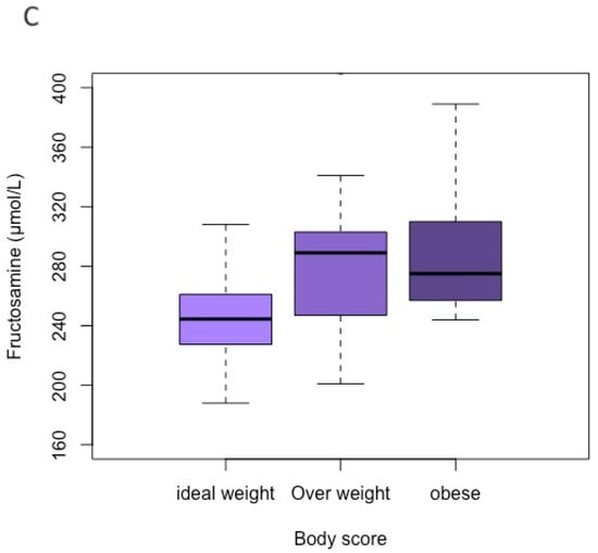 For the variables glucosis and fructosamine, their values did not differ significantly according to gender and age group. For blood glucose, there was a difference only between obese and ideal-weight cats (p = 0.029). The median blood glucose levels of the ideal-weight, overweight, and obese groups were 104.0 mg/dL (IQR 93.3–115), 123.0 mg/dL (IQR 103–136), and 133.0 mg/dL (IQR 113–165), respectively (Figure 1B). For serum fructosamine concentration, there were no statistically significant differences among the BCS groups, and their median values of the ideal-weight, overweight, and obese groups were 245.0 µmol/L (IQR 228–259), 289.0 µmol/L (IQR 248–301), and 275.0 µmol/L (IQR 257–310), respectively (Figure 1C).