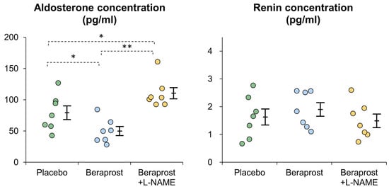Comparison of plasma aldosterone and renin concentrations (PAC and PRC) in cats administered placebo, beraprost, and beraprost combined with L-NAME (NOS inhibitor). Data represent dot plots for each phase (dot color), mean ± SE of seven cats. * p < 0.05, ** p < 0.01 by one-way repeated measures ANOVA followed by Holm–Bonferroni-corrected t test.