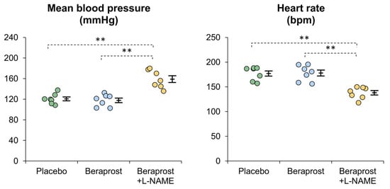Comparison of mean blood pressure (MBP) and heart rate in cats administered placebo, beraprost, and beraprost combined with L-NAME (NOS inhibitor). Data represent dot plots for each phase (dot color), mean ± SE of seven cats. ** p < 0.01 by one-way repeated measures ANOVA followed by Holm–Bonferroni-corrected t test.