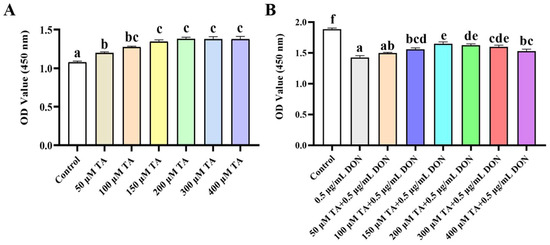 The effect of TA on the viability of IPEC-J2 cells exposed to DON. (A) IPEC-J2 cells were treated with TA (0, 50, 100, 150, 300, and 400 μM) for 24 h. Cell viability was determined using the CCK-8 assay. (B) After pretreatment with different concentrations of TA (50, 100, 150, 200, 300, and 400 μM) for 24 h, the cells were exposed to DON (0.5 μg/mL) for another 24 h. Data are shown as mean ± SEM (n = 6). Significant differences are indicated by different letters; the same set of letters indicates no significant difference between groups.
