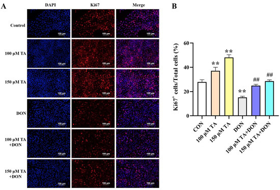 Ki67 staining was utilized to evaluate the effect of TA on DON-induced cell proliferation impairment. Cells with red-stained nuclei were considered as Ki67-positive cells (proliferating cells). The results indicated that 100 and 150 μM TA could reverse the proliferation impairment caused by DON (Figure 2, p < 0.01). Based on the fact that treatment with TA can help to reduce the negative impact of DON on cell viability and proliferation, 150 μM TA has a better effect (p < 0.05). Therefore, 150 μM TA was selected to evaluate TA’s relieving effect on DON-induced damage in the following experiment.