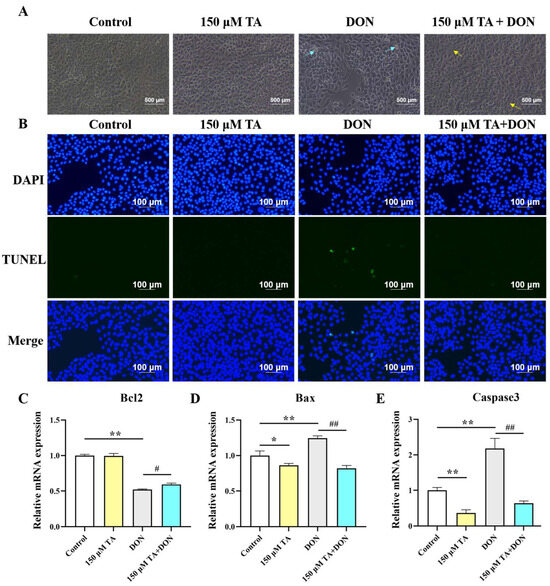 Effect of TA on DON-induced cell morphology and apoptosis. (A) After pretreating the cells with 150 μM TA for 24 h, they were exposed to 0.5 μg/mL DON for another 24 h. Then, cell morphology was evaluated by capturing images of the cells. The cyan arrows indicate shrunken or fragmentated cells; the yellow arrows indicate normal or dividing cells. The magnification is 40×. (B) TUNEL staining. (C–E) Relative expression of Bcl2, Bax, and Caspase3. Data are shown as mean ± SEM (n = 3). Control: control group; 150 μM TA: 150 μM TA group; DON: 0.5 μg/mL DON group; 150 μM TA + DON: 150 μM TA + 0.5 μg/mL DON group. * p < 0.05, ** p < 0.01, # p < 0.05, and ## p < 0.01. * stands for comparison with the control group, and # stands for comparison with the DON group.