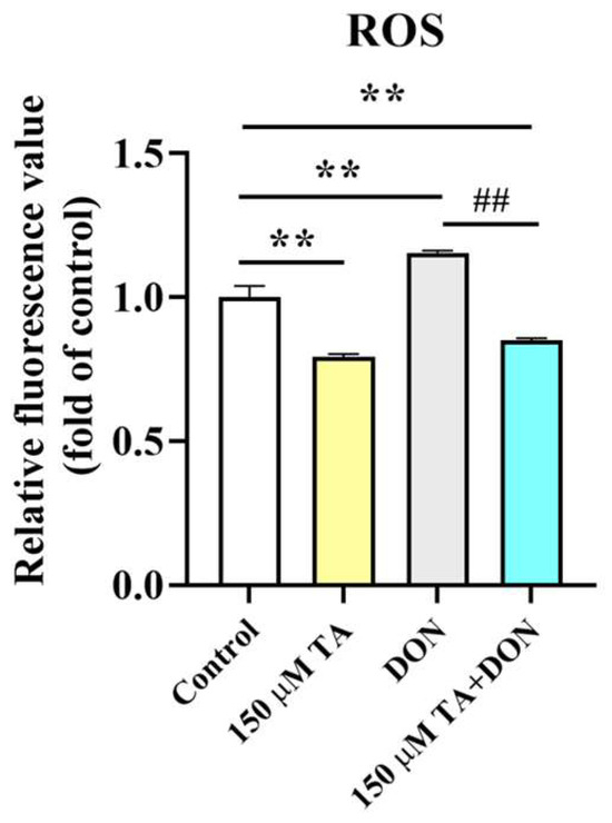 Effect of TA on intracellular ROS levels. Fluorescence values were determined using a fluorescence microplate. Data are shown as mean ± SEM (n = 3). Control: control group; 150 μM TA: 150 μM TA group; DON: 0.5 μg/mL DON group; 150 μM TA + DON: 150 μM TA + 0.5 μg/mL DON group. ** p< 0.01; ## p < 0.01. ** stands for comparison with the control group, and ## stands for comparison with the DON group.