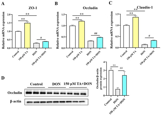 The intestinal physical barrier is crucial for gut health. Its integrity depends on the tightness of the connections in the intestines. When harmful substances or pathogens damage the gut, its integrity is disrupted. We observed that DON significantly inhibited the mRNA expressions of ZO-1, occludin, and Claudin1 (p < 0.01). TA pretreatment reversed the DON-induced inhibition of the mRNA expressions of ZO-1 (p < 0.05), occludin (p < 0.01), and Claudin1 (p < 0.05) (Figure 5A–C). The expression of the protein occludin was also determined. The Western blotting results are in agreement with the RT-qPCR results. Compared with the DON group, occludin expression was increased in the TA + DON group (Figure 5D, p < 0.05). Additionally, the group of cells treated with TA alone showed a significantly up-regulated tight junction expression (Figure 5, p < 0.01).