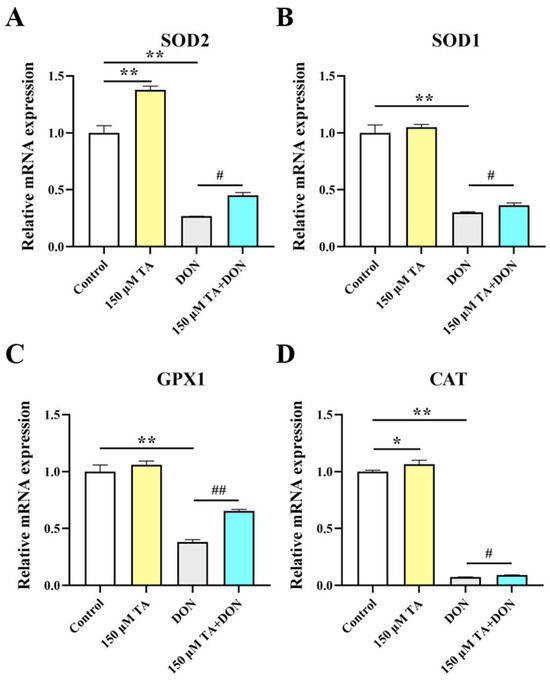 Subsequently, we further investigated the changes in the antioxidant capacity of the IPEC-J2 cells under DON exposure and the effect of TA pretreatment. The results indicated that the mRNA expression of the SOD2, SOD1, GPX1, and CAT genes was significantly inhibited by DON (p < 0.01), and pretreatment with TA significantly attenuated the DON-induced decreases in the mRNA expression levels of the SOD2 (p < 0.05), SOD1 (p < 0.05), GPX1 (p < 0.01), and CAT (p < 0.05) genes (Figure 6).