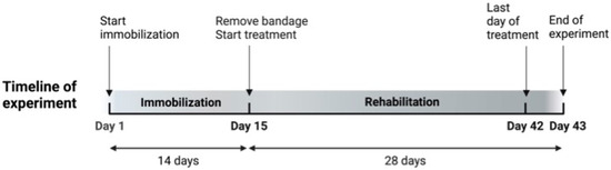 The timeline of the experiment is shown in Figure 1. The day immobilization started was set as Day 1. All rats were measured for the ROM of the stifle joint before immobilization. The bilateral hindlimbs of rats in Groups I, S, U, N, and UN were then immobilized for 14 days. On Day 15, the bandage was removed, and the ROM of the stifle joint was measured. The rats in Groups C and I were then euthanized, the quadriceps muscles were harvested, and the quadriceps muscles were evaluated histopathologically for quadriceps contractures. In Groups U, N, and UN, a 28-day rehabilitation treatment started. Rats in Group S did not receive treatment. On Day 43, rats in Groups S, U, N, and UN were measured for the ROM of the stifle joint and the creatinine phosphokinase level and euthanized. After euthanasia, quadriceps muscles were harvested.