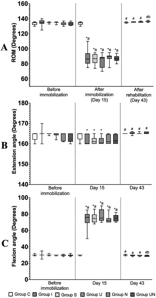 (A) ROM of the stifle joint (°), (B) extension angle, and (C) flexion angle of the stifle joint of rats. Values are expressed as median with interquartile ranges. Group C; control group (n = 12); Group I, immobilization-alone group (n = 12); Group S, immobilization and spontaneous recovery group (n = 12); Group U, immobilization and therapeutic ultrasound group (n = 12); Group N, immobilization and NMES group (n = 12); Group UN, immobilization and therapeutic ultrasound and NMES combination group (n = 12). *, significant difference from before immobilization in the same group (p < 0.05); #, significant difference from Day 15 in the same group (p < 0.05); a, significant difference from Group C in the same period (p < 0.05); b, significant difference from Group S in the same period (p < 0.05).