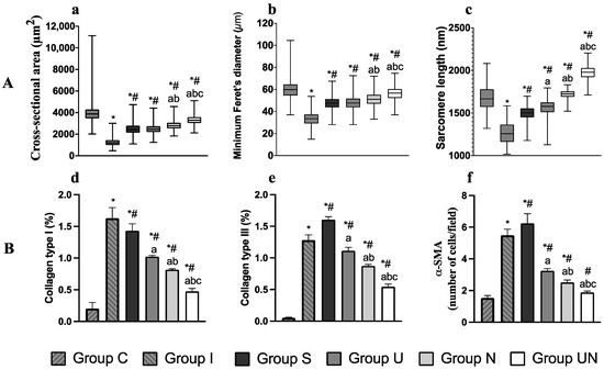 (A) Histological analysis of quadriceps muscles using H&E staining. Values are expressed as medians with interquartile ranges. (a) cross-sectional area, (b) minimum Feret’s diameter, and (c) sarcomere length. (B) Immunohistochemical analysis of quadriceps muscle. Values are expressed as mean ± standard deviation. (d) the percentage of collagen type I, (e) the percentage of collagen type III, and (f) the number of α-smooth muscle actin (α-SMA)-positive cells. Group C, control group; Group I, immobilization-alone group; Group S, immobilization and spontaneous recovery group; Group U, immobilization and therapeutic ultrasound group; Group N, immobilization and NMES group; Group UN, immobilization and therapeutic ultrasound and NMES combination group; *, significant difference from Group C (p < 0.05); #, significant difference from Group I (p < 0.05); a, significant difference from Group S (p < 0.05); b, significant difference from Group U (p < 0.05), c, significant difference from Group N (p < 0.05).
