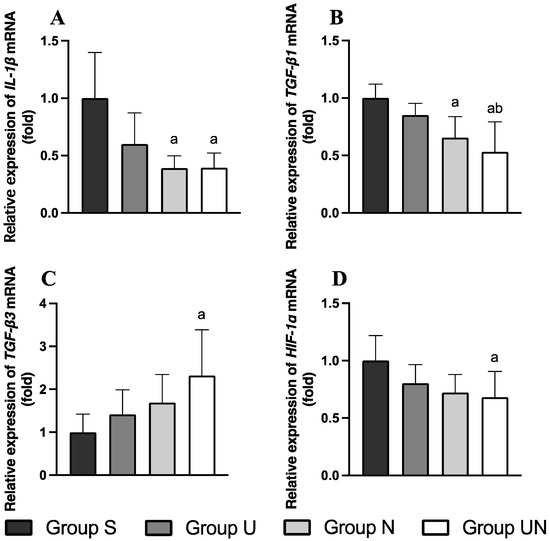Expression levels of IL-1β (A), TGF-β1 (B), TGF-β3 (C), and HIF-1α (D) mRNA. Values are expressed as mean ± standard deviation. Group S, immobilization and spontaneous recovery group (n = 6); Group U, immobilization and therapeutic ultrasound group (n = 6); Group N, immobilization and NMES group (n = 6); Group UN, immobilization and therapeutic ultrasound and NMES combination group (n = 6); a, significantly different from Group S (p < 0.05); b, significantly different from Group U (p < 0.05).
