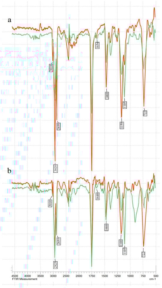 The transmittance % was measured in the mid-IR spectrum range (400–4000 cm−1) (see Figure 1). The main changes during ozonation occurred at 722–723 cm−1 (overlapping of the methylene rocking vibration and the out-of-plane vibration of cis-disubstituted olefins), 1105 cm−1 (–C–O stretching), 1155–1163 cm−1 (sv of –C–O), 1460–1465 cm−1 (the bending vibrations of CH2 and CH3 aliphatic groups), 1654 cm−1 (the C=C stretching vibration of cis-olefins), 3009 cm−1 (C=C–H stretching), and in the bands at 2922 and 2853 cm−1, which are attributed to the symmetric and asymmetric stretching vibration of the aliphatic CH2 group [,,,].
