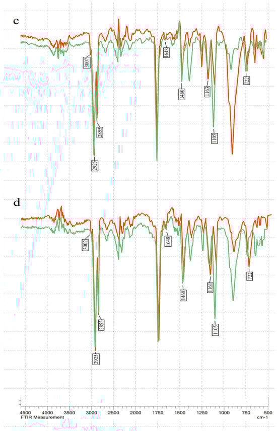 FT-IR spectra of oils before (red line) and after (green line) ozonation: (a) linseed oil; (b) hemp seed oil; (c) sunflower oil; (d) olive oil.