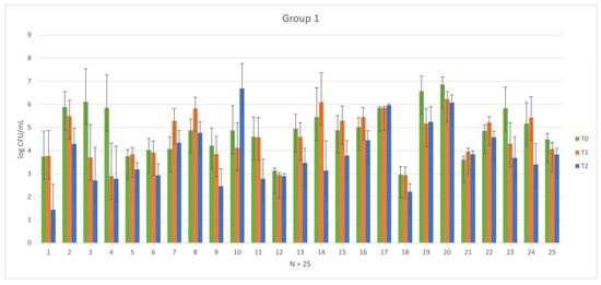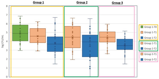 As shown in Figure 1, for Group 1 the difference between pre-treatment phase T0 and post-antibiotic phase T1 was 0.271 log CFU/mL, while the difference between post-antibiotic phase T1 and post-treatment phase T2 was 0.795 log CFU/mL. When the full trail was evaluated, the differences between the pre-treatment phase T0 and post-treatment phase T2 were 1.066 log CFU/mL for Group 1, 0.906 log CFU/mL for Group 2 and 0.841 log CFU/mL for Group 3.