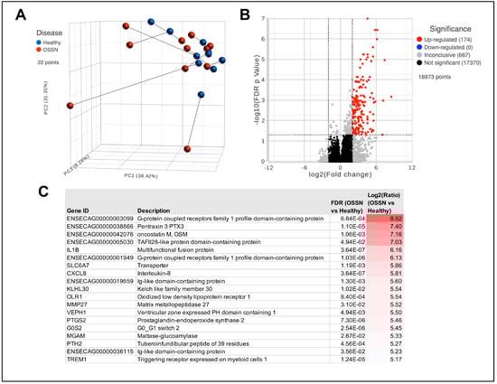Transcriptomic differences in OSSN vs. normal ocular surface cells. (A) Principal component analysis (PCA) plot of n = 11 horses, with OSSN-affected eyes shown in red and normal matched horse eye shown in blue. (B) Volcano plot of Deseq differential gene expression analyses results. X-axis shows Log2 Fold change comparing OSSN vs. Normal and y-axis shows −Log10 false discovery rate adjusted p-value. Significance was defined as FDR ≤ 0.05 and fold change ≥ 2Log2 or ≤−2Log2. (C) List of top 20 significantly upregulated genes in OSSN-affected eyes with gene description, adjusted p-value, and fold change.