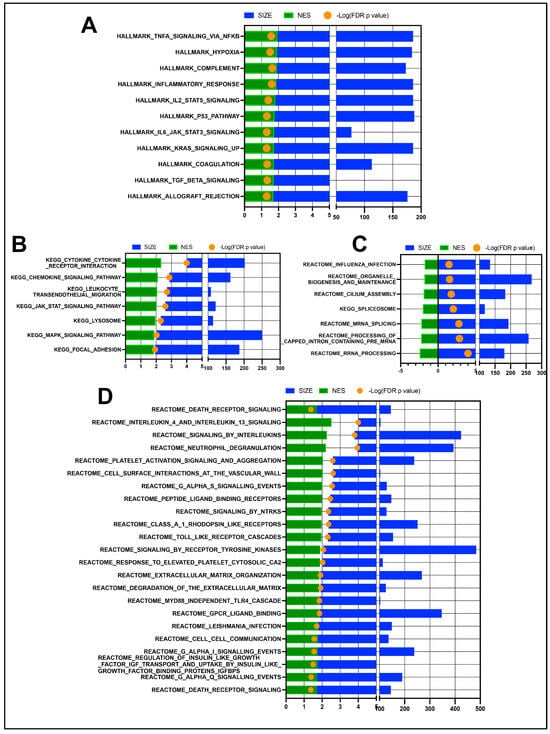 GSEA pathway analysis results of n = 11 OSSN-affected ocular swab cells vs. normal. (A) Stacked bar graph of Hallmark gene sets with FDR adjusted p-value ≤ 0.05. Normalized enrichment scores shown in green (positive for upregulated in OSSN), total genes mapped to pathways shown in blue and –log10(FDR p-value) in orange dot (>1.3 values significant). (B) Significant KEGG pathways upregulated in OSSN eyes. (C) significantly downregulated KEGG and Reactome pathways in OSSN. (D) additional significantly upregulated Reactome pathways in OSSN.