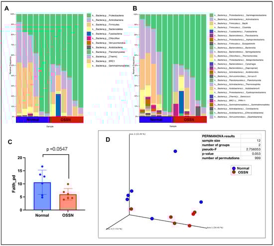 Ocular microbiome composition of OSSN-affected eyes compared to matched normal controls. (A) Taxonomy results of n = 6 horses, showing relative abundance at phylum level composition. (B) relative microbial abundance at class level showing a total of 26 classes of bacteria found in 12 samples. (C) Alpha diversity of OSSN vs. normal showing Faith metric with perceive distance (p) on y axis. Significance computed using paired parametric T test. (D) Beta diversity computed using weighed unifrac distance measurements. Normal samples in blue, OSSN in red. Statistical significance computed using QIIME2 permanova.
