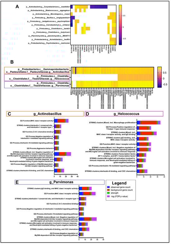 Ocular Interactome of equine OSSN. Differentially expressed genes (OSSN vs. normal) with fold change ≤ −1.5log2 or ≥1.5Log2 and FDR ≤ 0.05 were correlated with relative abundance of genus and species level microbial taxon. (A) shows significant correlations with 5 species and DEGs. r values shown in color scale. (B) Three genus-level taxon with >100 significant correlations with differentially expressed genes. Correlation r values shown in color scale, white spaces nonsignificant. (C) stacked bar graph of String protein annotation for DEGs significantly correlated with genus Actinobacillus. Pathways chosen with highest strength and p value ≤ 0.05. graph legend shown in bottom right. Blue shows number of DEGs in pathway, red shows total genes present in each pathway set. Green strength of association and purple for –Log10 FDR adjusted p-value. (D) top 10 strength String protein annotation pathways for DEGs correlated with genus Helcococcus. (E) top 10 strength String protein annotation pathways for DEGs correlated with genus Parvimonas.