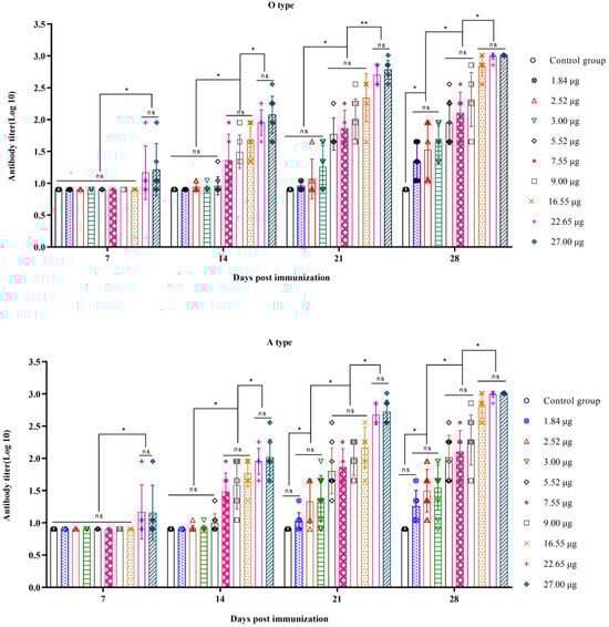 The antibody titers in log base 10 of type O and A following primary immunization at different days post-vaccination with varying 146S doses in the administered vaccines.