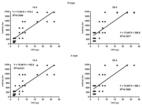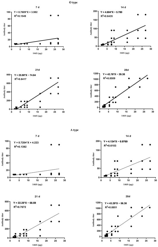The immunization boost was conducted on day 28 after the initial vaccination, and the antibody titers were assessed on days 14 and 28 after the boost to determine the rates of satisfactory antibody titers. On days 14 and 28 after the boost, the levels of O-type FMDV antibodies induced in the 27.00 µg, 22.65 µg, and 16.55 µg groups were significantly greater than those induced in the 9.00 µg, 7.55 µg, and 5.52 µg groups (p < 0.05), while the latter groups showed significantly greater levels than the 3.00 µg, 2.52 µg, and 1.84 µg groups (p < 0.05) (Figure 3A). The levels of A-type FMDV antibodies after the boost on days 14 and 28 were similar to those of O-type FMDV antibodies (Figure 3B). Further analysis revealed a strong correlation between antibody titers and 146S contents on days 14 and 28 after the boost (day 14: O, R2 = 0.7809, p < 0.0001; A, R2 = 0.8121, p < 0.0001; day 28: O, R2 = 0.7677, p < 0.0001; A, R2 = 0.7609, p < 0.0001) (Figure 4). For both the O-type and A-type groups, the rates of satisfactory antibody titers reached 100% on days 14 and 28 after the boost for all dosage groups. In summary, prime–boost immunization elicited a stronger immune response than prime vaccination only, and higher 146S contents resulted in higher antibody titers at the same time points after vaccination.