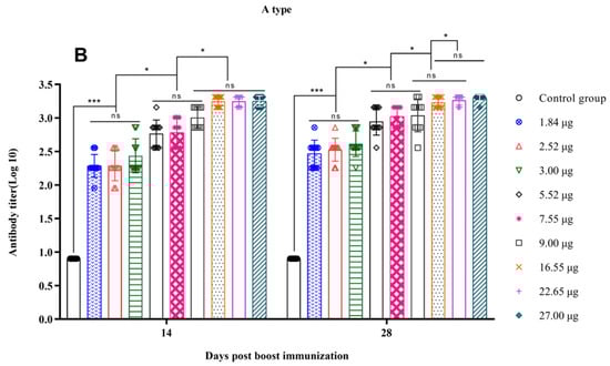 The antibody titers in log base 10 of type O (A) and type A (B) following booster immunization at different days post-vaccination with varying 146S doses in the administered vaccines.