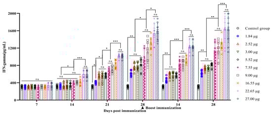 This study aimed to measure the levels of IFN-γ secretion at different time points after primary and booster immunizations by comparing different dosage groups. On day 7 after primary immunization, there was no significant difference in IFN-γ secretion compared to that in all groups (p > 0.05). However, on day 14, the 27.00 µg and 22.65 µg dosage groups showing significantly greater levels than the 16.55 µg, 9.00 µg, 7.55 µg, 5.52 µg, 3.00 µg, and 2.52 µg dosage groups (p < 0.001), while the latter groups showed significantly greater levels than the 1.84 µg group (p < 0.05). By day 21, the 27.00 µg and 22.65 µg dosage groups exhibiting significantly greater IFN-γ secretion levels than the 16.55 µg, 9.00 µg, and 7.55 µg dosage groups (p < 0.001). The IFN-γ secretion levels in the 16.55 µg, 9.00 µg, and 7.55 µg dosage groups were significantly greater than those in the 5.52 µg, 3.00 µg, and 2.52 µg dosage groups (p < 0.05), and the IFN-γ secretion levels in the 5.52 µg, 3.00 µg, and 2.52 µg dosage groups were significantly greater than those in the 1.84 µg dosage group (p < 0.05). On day 28, the 27 µg and 22.65 µg dosage groups showing significantly greater levels than the 16.55 µg, 9.00 µg, and 7.55 µg dosage groups (p < 0.05), and the levels in the 16.55 µg, 9.00 µg, and 7.55 µg dosage groups were significantly greater than those in the 5.52 µg, 3.00 µg, 2.52 µg, and 1.84 µg dosage groups (p < 0.05). The differences in IFN-γ secretion levels on days 14 and 28 after booster immunization were similar to those observed on day 28 after first immunization (Figure 5).