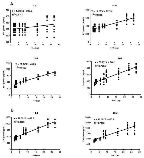Further analysis revealed a moderate correlation between IFN-γ secretion and the 146S concentration on day 14 after primary immunization (R2 = 0.6995, p < 0.0001) and a strong correlation on days 21 and 28 (21 days: R2 = 0.8669, p < 0.0001; 28 days: R2 = 0.7755, p < 0.0001) (Figure 6A). A strong correlation was also found between antibody titers and 146S contents on days 14 and 28 after booster immunization (14 days: R2 = 0.8505, p < 0.0001; 28 days: R2 = 0.7598, p < 0.0001) (Figure 6B). In summary, higher 146S levels were associated with greater IFN-γ secretion at the same post-immunization time points.