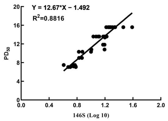 The vaccines underwent homogenization, followed by separation and purification utilizing sucrose density gradient centrifugation to quantify the 146S content at each vaccine dose. Twenty-eight days after vaccination, the PD50 test was performed. The 146S contents in 46 batches of type O foot-and-mouth disease inactivated vaccines ranged from 4.72 to 38.90 µg/dose, with corresponding PD50 values ranging from 7.05 to 15.59 (Table S1). Within the range of 4.72–16.55 µg/dose, higher 146S contents showed a positive correlation with higher PD50 values. Furthermore, when the 146S content reached ≥16.55 µg, the PD50 values consistently reached a maximum of 15.59. Further analysis revealed a strong correlation between the 146S content of the vaccine and the PD50 (R2 = 0.8816, p < 0.0001) (Figure 7).