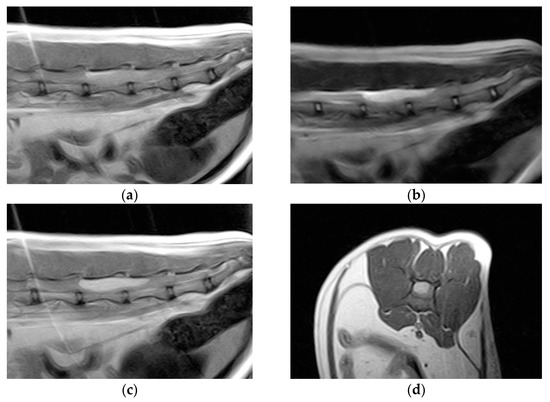 A 13-month-old, neutered, male, domestic shorthaired cat was referred with a clinical history of progressive paraparesis, proprioceptive ataxia, and lumbar spinal pain. Two months earlier, the cat showed difficulty in jumping and spinal pain that was treated with meloxicam (0.1 mg/kg q24h orally for 7 days) with partial response. Plantigrade stance and proprioceptive ataxia were noticed approximately one month following the onset of symptoms. At referral, neurological examination revealed non-ambulatory paraparesis and depressed patellar and withdrawal reflexes in both pelvic limbs. The trunk cutaneous reflex was absent caudally from L3, and the perineal reflex was normal. Lumbar hyperesthesia was noticed on palpation. These findings were deemed consistent with L4-S2 myelopathy.