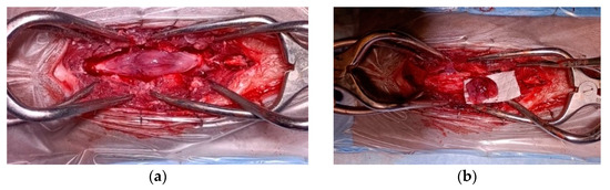 Hematology and blood biochemistry were unremarkable. Thoracolumbar column radiographs were normal. The cat was anesthetized and positioned for magnetic resonance imaging (MRI) of the thoracolumbar spinal cord (Esaote Vet-MR 0.2T, Genoa, Italy). T1-weighted sagittal and transverse scans, T2-weighted sagittal and transverse scans, and T1-weighted sagittal and transverse scans post-contrast (0.1 millimoles/kg of gadoteric acid—Claryciclic®, GE Healthcare s.r.l., Milano, Italy) were acquired. MRI identified an intradural extramedullary space-occupying mass extending from L5 to L6. The mass was dorsal and elliptical in shape (35 mm length, 8.3 mm width, and 7.2 mm height) and had sharp margins. It was homogeneously hyperintense in T2-weighted and isointense in T1-weighted scans and exhibited marked and homogeneous contrast enhancement in the T1-weighted post-contrast scans. The mass caused severe spinal cord compression (Figure 1).