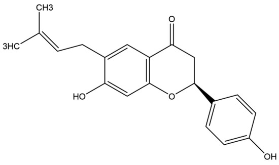 Dried P. corylifolia seeds (2.4 kg) were purchased from a local market. Methanol (MeOH, 10 L) was extracted for 7 days. The methanol extract was concentrated under a vacuum, resulting in the formation of a dark brown solid (214.5 g) via evaporation, which was suspended in distilled water (1 L) and extracted with ethyl acetate (EtOAc) solvent. Then, bavachin (a phenolic compound) (Figure 1) was isolated using an EtOAc extract [19]. The comprehensive procedure for compound purification has been outlined in a previous report [19].