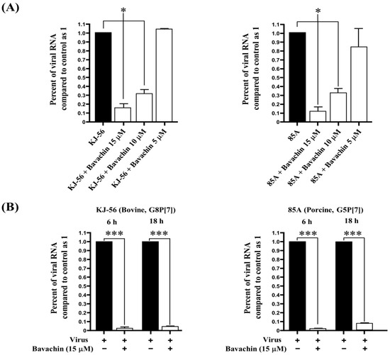 Suppression of rotavirus viral RNA synthesis (NSP3 gene) through bavachin treatment. (A) MA-104 cells were infected with rotavirus (G8P[7] bovine rotavirus and G5P[7] porcine rotavirus) at 0.01 multiplicity of infection (MOI). After 1 h, viruses were removed, and cells were then subjected to treatment with either 0.5% dimethyl sulfoxide (DMSO) or bavachin (5–15 μM). After 24 h of incubation, total RNA was extracted, and intracellular viral RNA levels were quantified. Rotavirus RNA levels were normalized using GAPDH. (B) MA-104 cells were infected with the 0.01 MOI rotaviruses. After 1 h, rotaviruses were removed, and the solution replaced with α-MEM supplemented with 0.5% DMSO or 15 μM of bavachin. Total RNA was extracted at 6 h and 18 h after infection, and levels of intracellular rotavirus RNA were quantified. Rotavirus RNA levels were normalized using GAPDH. Data are presented as mean ± SEM (n = 3), * p < 0.05, *** p < 0.001.