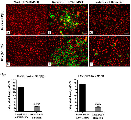 Suppression of rotavirus viral protein synthesis (VP6) through bavachin treatment. MA-104 cells were infected with rotaviruses (bovine rotavirus, G8P[7] and porcine rotavirus, G5P[7]) at 0.01 multiplicity of infection (MOI) for 1 h. The solution was removed and replaced with α-MEM supplemented with (B,E) 0.5% DMSO or (C,F) 15 μM of bavachin (C,F), or (A,D) cells were mock-infected. After 24 h, cells were fixed in 4% paraformaldehyde, blocked, and incubated with an anti-VP6 antibody (green). Propidium iodide was used as nuclear counterstain (red). Scale bar = 50 μm. (G) Quantification of green fluorescence related to VP6 protein levels was performed using version 1.8.0. ImageJ software. Data are presented as mean ± SEM (n = 3), *** p < 0.001.