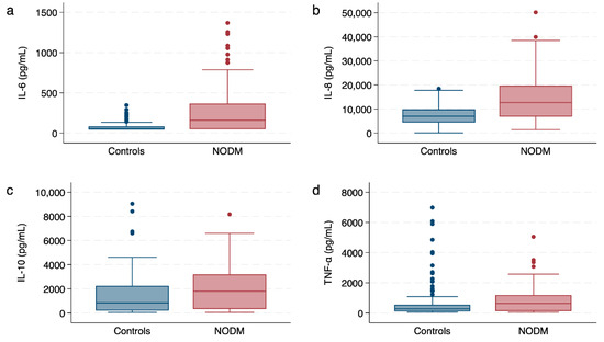 Box and whisker plots illustrating leukocyte cytokine response for (a) IL-6, (b) IL-8, (c) IL-10, and (d) TNF-α between control dogs and dogs with naturally occurring diabetes mellitus (NODM), controlling for intervention (calcitriol or ethanol) or stimulant (phosphate-buffered solution, lipopolysaccharide, lipoteichoic acid). Each of the 40 dogs, 20 per group (control or NODM), had a cytokine value for each of the six unique combinations of intervention and stimulant for a total of 120 values per group for each plot. Line at median, bounds of box at the 25th and 75th percentile, whiskers at the upper and lower adjacent values (Tukey method), and dots at outliers beyond the adjacent values.