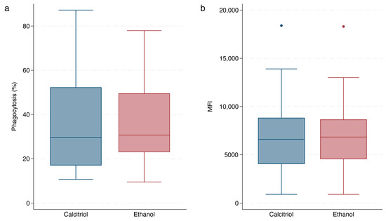 The leukocyte phagocytic capacity of opsonized E. coli was not affected by incubation with calcitriol in this study. Calcitriol augments the phagocytosis of immune cells from people, rats, and cows [34,37,77,78]. However, two previous studies in dogs failed to show that calcitriol affected the GM phagocytic capacity of E. coli [40,68]. One possible reason for these conflicting results is that the dog studies focused on the phagocytosis of E. coli, whereas the previously mentioned studies in other species used Mycobacterium bovis, heat-killed baker’s yeast, fluorescent carboxyl microspheres, and Pseudomonas aeruginosa [34,37,77,78]. There are conflicting reports on the benefit of calcitriol against E. coli. [79,80]. Therefore, it is possible that calcitriol induces variable host immune responses dependent on the encountered pathogen.