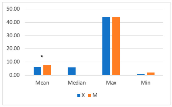 The graph shows mean, median, and maximum and minimum respiratory rate (RR) values in Groups X and M. The vertical axis refers to breaths/min. * represents that differences in mean were statistically significant (independent sample t-test, significance level set to p < 0.05).