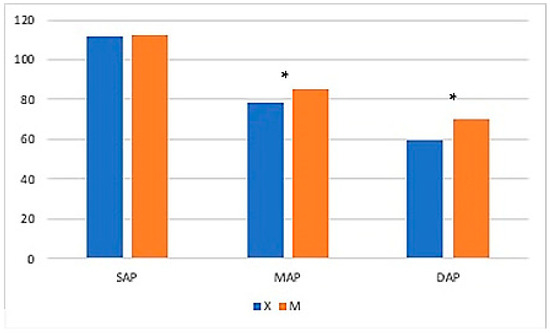 The graph shows mean systolic arterial pressure (SAP), mean arterial pressure (MAP), and diastolic arterial pressure (DAP) values in Groups X and M. The vertical axis refers to mmHg. * represents that differences in mean were statistically significant (independent sample t-test, significance level set to p < 0.05).
