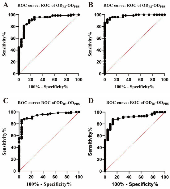 There were 97 cattle (74 positive and 23 negative cattle) tested using the DIVA RCE-IGRA. Four concentrations of RCE developed four ROCs, and each ROC generated a cut-off value of ODRCE-ODPBS (Figure 1). Specifically, when the RCE concentration was set to 2 μg/mL, the cut-off value was 0.09 with 81.08% (60/74, 95% CI: 70.71–88.38) that tested positive and 91.30% (21/23, 95% CI: 73.20–98.45) that tested negative, respectively. When the RCE concentration was set to 4 μg/mL, the cut-off value was 0.15, 91.89% (68/74, 95% CI: 83.42–96.23) that tested positive, 95.65% (22/23, 95% CI: 79.01–99.78) tested negative respectively. When RCE concentration was set to 6 μg/mL, the cut-off value was 0.10 with 86.49% (64/74, 95% CI: 76.88–92.49) that tested positive and 95.65% (22/23, 95% CI: 79.01–99.78) that tested negative, respectively. When the RCE concentration was set to 8 μg/mL, the cut-off value was 0.06 with 87.84% (65/74, 95% CI: 78.47–93.47) that tested positive and 86.96% (20/23, 95% CI: 79.01–99.78) that tested negative, respectively.