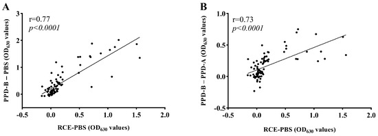 Furthermore, we performed Spearman’s correlation analysis of the plasma samples from 86 cattle stimulated with PPD and RCE OD630 values. There was a strong positive correlation between PPD-B and RCE OD630 values in plasma samples from the same animals (r = 0.77 and p < 0.0001, Figure 2A) with the PPD-B–PPD-A and RCE OD630 values (r = 0.73, p < 0.0001, Figure 2B).