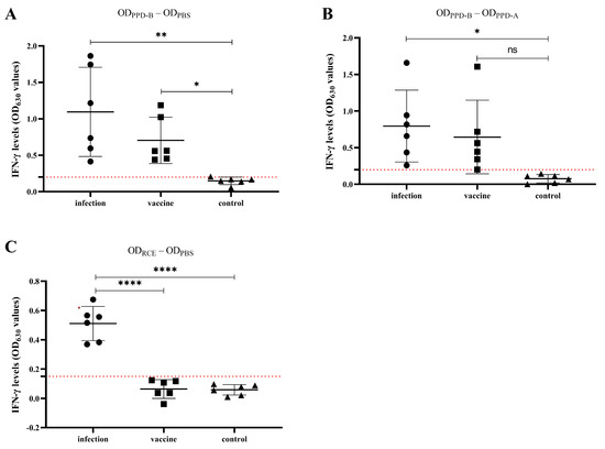 Differentiation of naturally infected and BCG-vaccinated calves via RCE and PPD-based whole blood IFN-γ release assay (IGRA). (A,B) IFN-γ levels of calves in infected, vaccinated, and PBS control groups detected via commercial PPD-IGRA (the red dashed line represents the cut-off value of 0.20). (C) IFN-γ levels of calves in infected, vaccinated, and PBS control groups detected via RCE-IGRA (the red dashed line represents the cut-off value of 0.15). ns, not significant. *, **, and **** represent p < 0.05, p < 0.01, and p < 0.0001, respectively.
