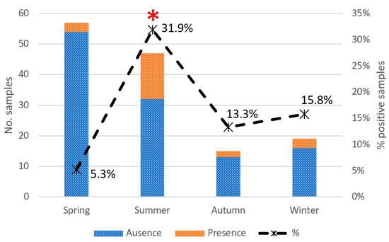 Campylobacter prevalence by season in urban birds (* p < 0.01). Bars indicate the total number of samples, with different colors depending on the absence (dark) or presence (light) of Campylobacter. The dashed line indicates the percentage of positive samples about the total number of samples.