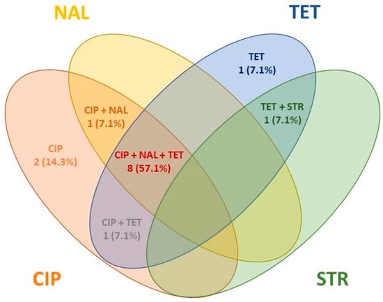 Among the resistant isolates (n = 14), 12 were identified as C. jejuni, 1 as C. coli, and 1 as C. lari. The antimicrobial resistance patterns of Campylobacter isolates are summarized in Table 5 and Figure 3. No MDR isolates were detected.