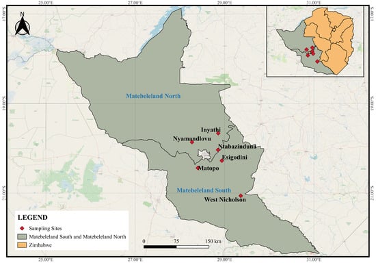 All sampling sites of the study located in the Matebeleland region of Zimbabwe.