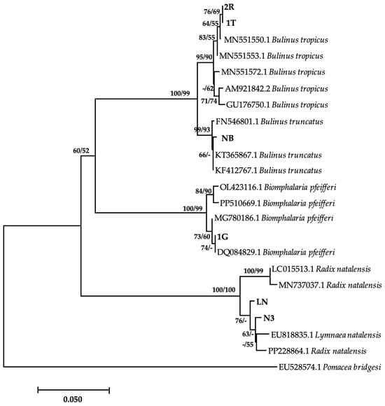 Neighbor-joining tree-based COI gene illustrating the relationship between freshwater snails obtained from game ranches, conservancies, and game parks located in the Matebeleland region of Zimbabwe and the closest matches from the NCBI GenBank. The nodal support values (%) indicated in an order using neighbor-joining and maximum likelihood. 2R, IT, NB, 1G, LN, N3 = isolates from the study. The 50% majority-rule was applied, and any support value of lower than 50% was represented by a hyphen.