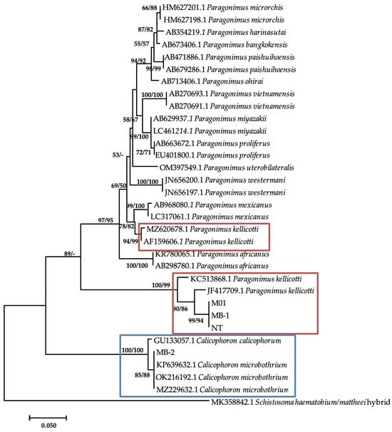 Additional bands were observed at approximately 280–290 base pairs from M. tuberculata (n = 9) and Bul. tropicus (n = 1), from Esigodini and Bul. truncatus (n = 1), and from Ntabazinduna, indicating a mixed infection. Sequencing of three of the additional bands from M. tuberculata and BLAST analysis showed a similarity index of 96.42% to Paragonimus kellicotti (Table 4). The sequences were submitted to GenBank as Paragonimus sp. under the accession numbers of PP392960, PP392961, and PP392963. Phylogenetic analysis showed that these sequences formed a clade with two P. kellicotti isolates from India (KC523868.1) and the United States (JF4177709.1) from Indoplarnobis exustus and Orconectes virilis, respectively. The genetic distance within this clade was 3%. This clade also formed a monophyletic sister clade with various Paragonimus species, including two more P. kellicotti (Figure 3). The genetic p-distance between these two clades was 28%.