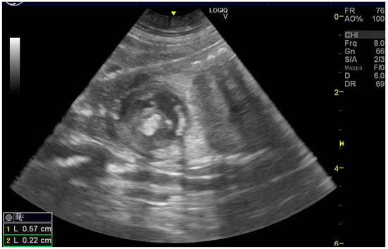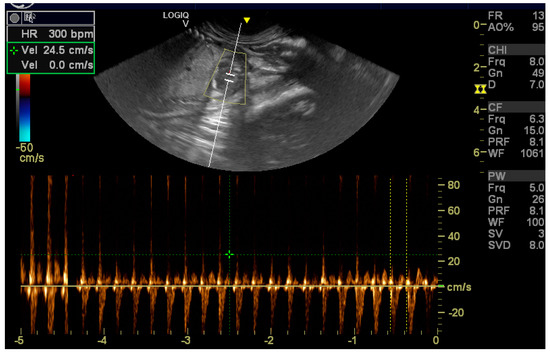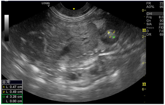 A seven-year-old healthy female Chow Chow dog was referred to reproduction specialists to monitor her pregnancy. The exam was conducted using a GE Logiq V2 ultrasound machine (GE Health Cre, Milan, Italy)equipped with a 12 LRS linear probe and an 8 CRS micro-convex probe. The ultrasonographic exam (US) was performed on day 25 of pregnancy, and all parameters were within physiological limits. Progesterone concentration was measured using the Tosoh AIA360 (Tokyo, Japan) analyzer due to a history of hypoluteinism. The results were 34 ng/mL at diagnosis and 36 ng/mL one week later. On day 42 of pregnancy, the US detected the following parameters: anechoic liquid in all neonates without echoic smoke and all fetuses showing growth rates consistent with the pregnancy date. Only one of the five fetuses presented an abnormal, echoic mass inside its heart (Figure 1). It was located in the left atrioventricular junction, displaying a soft fringe and a light shadow cone. The diameter measured was 0.49 cm on the puppy’s dorso-ventral axis and 0.47 on the craniocaudal axis. The fetus’s heart rate (HR) was 273 beats per minute (BPM). All other organs exhibited proper development and had no significant anomalies. No fluid was found in the abdomen or thorax cavities. Once a week, the pregnancy was monitored using the same parameters, such as assessing the placental thickening and amniotic fluid levels. The fetuses were checked for mass diameter and HR. After 5 days, the fetus had a mass with dimensions of 0.57 cm along the dorso-ventral axis and 0.22 cm along the craniocaudal axis and with a heart rate of 300 beats per minute (Figure 2 and Figure 3), while the others had a lower heart rate of approximately 220–240 BPM. None of the puppies had free fluid in the abdomen or thorax.