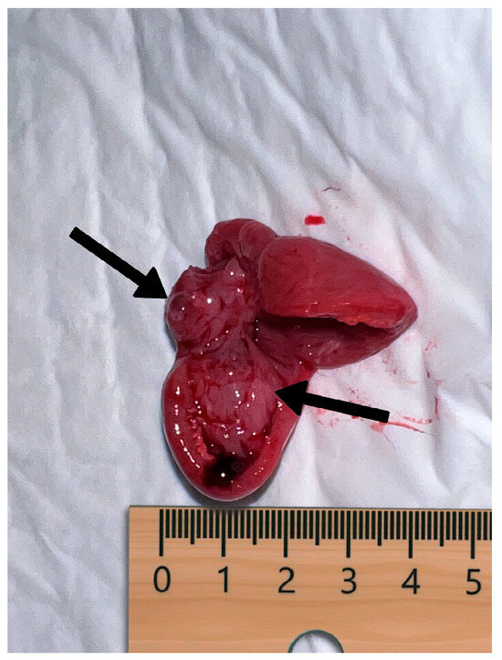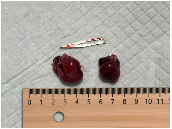 The pregnancy concluded, and vaginal birth began on day 63 post-ovulation. Five puppies were born; the first two were stillborn, and the others had APGAR scores of 9/10. The litter was homogeneous; the puppies weighed between 170 and 180 g, with no difference between deceased and surviving puppies, and all of them were well-developed. The necroscopy of the two stillborn puppies was performed in the clinic by a pathologist and neonatal expert within 3 h of death, without the newborns being refrigerated. The external and internal examinations of the puppies were within normal parameters for their age and sex. After correct positioning, with the belly facing upwards and the legs splayed, the abdomen was opened: no free fluid was found, and all organs were within normal limits. After that, the thorax was opened; no free fluid was found, and all organs were without macroscopic lesions. Pathologists found a unique difference between the two necroscopy exams in the thoracic cavity. One heart had no macroscopic lesions, and the other had an undeniable bump. The mass was immediately individuated after a simple opening along the sagittal axis. It was a space-occupying mass that expanded from the left atrium to the left ventricle until the distinction between them became impossible. It had a broad base and was pale red, identical to the originating organ (Figure 4 and Figure 5). The right compartments were without macroscopic lesions.