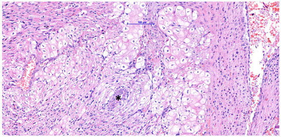 HE (hematoxylin and eosin). The myocardial mass comprises large, polyhedral cells with distinct margins and pale, vacuolated to granular cytoplasm. Note the perivascular arrangement of some cells (asterisk (*) = blood vessel).