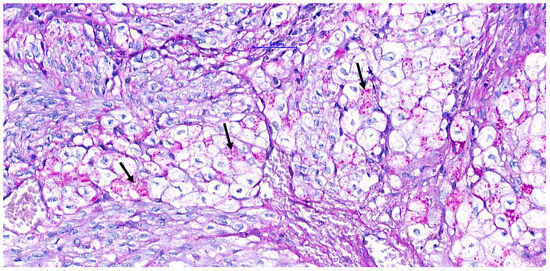 PAS (Periodic Acid Schiff). The neoplastic cells contain PAS-positive granular material (arrows).
