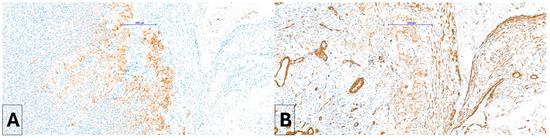 Immunohistochemistry. Neoplastic cells are multifocally positive to desmin (A) and AML (B).